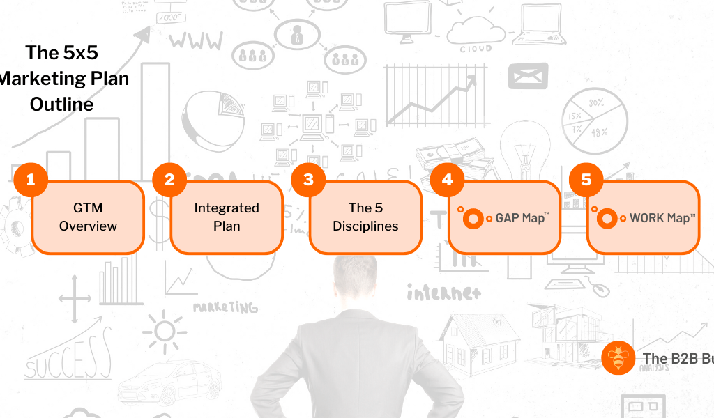 In Ethan M. Rasiel’s The Mckinsey Way he talks about McKinsey’s 5x5x5 rule as a way to present a persuasive business idea. Marketing Planning is no different. At TBM, we use a 5-slide deck that covers in order: GTM Overview; The Integrated Plan; The 5 Areas of Excellence; The GAP MAP; The WORK MAP. Each one of these slides is a visual that expresses our decision making and ultimate strategy. The Work Map is the bridge between strategy and tactics meaning what are we going to accomplish our goals in the next 6-12 months in 5 slides anyone can digest with a shared recording of it being presented.